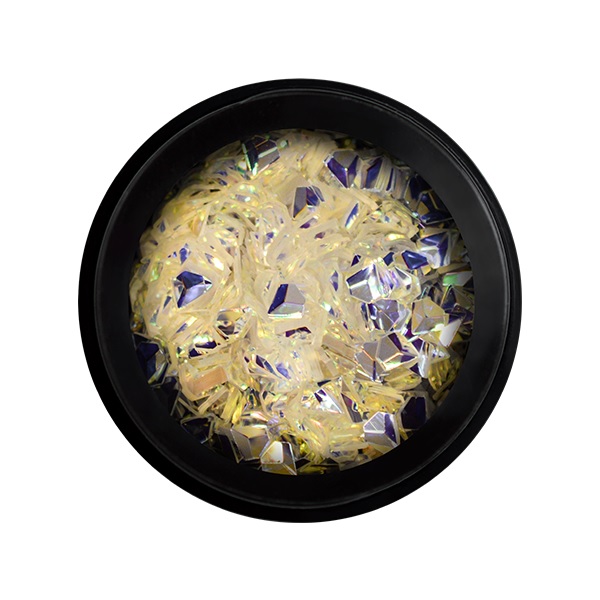 Lamelas com efeito de diamante. Estas lamelas podem encapsuladas com recurso a géis de construção, acrílicos, Liquid Stone Gel ou Glue Gel. Aplicar uma camada generosa de um top gel de maior consistência (por ex.º Nail Art Top Gel). |