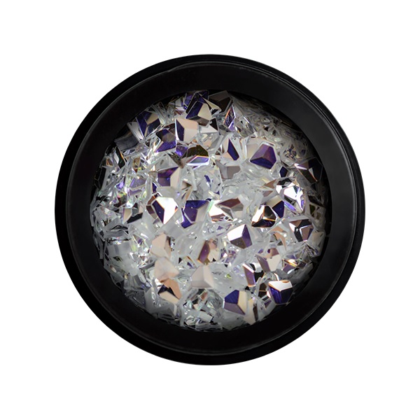 Lamelas com efeito de diamante. Estas lamelas podem encapsuladas com recurso a géis de construção, acrílicos, Liquid Stone Gel ou Glue Gel. Aplicar uma camada generosa de um top gel de maior consistência (por ex.º Brillant Top Gel). |