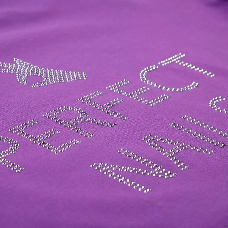 Camisola purple feminina para receberes as tuas clientes com uma imagem perfeita. Uma camisola de manga curta, com decote redondo com o logotipo em cristais para um look exclusivo.